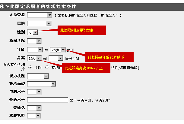 當(dāng)前位置:信息>> 怎樣設(shè)定多個條件(如同時限制性別、年齡、身高)進(jìn)行人才搜索